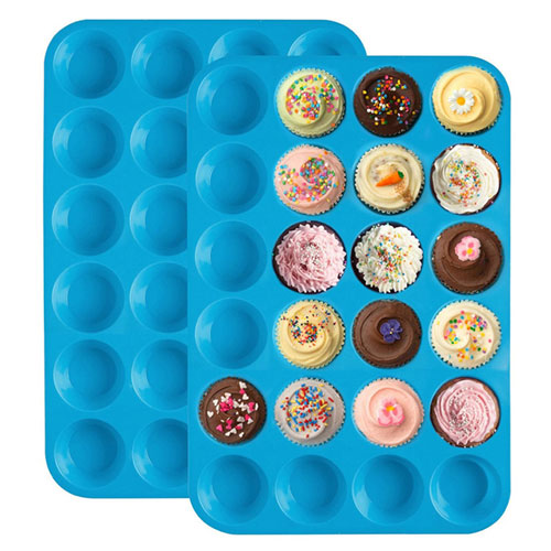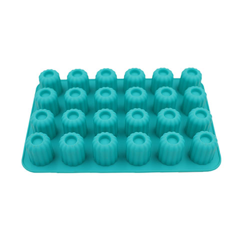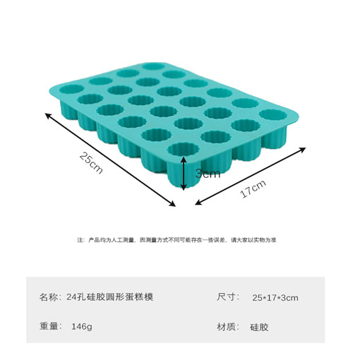 24孔硅胶圆形蛋糕模采用食品级硅胶制成,无毒无味,耐高温,符合美国FDA标准,环保无公害,使用寿命长,质地柔软,抗撕裂,手感好,不怕摔不怕压,携带方便,适用于微波炉、烤箱、冰箱、冰柜、洗碗机